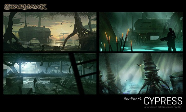 …there was a lot of discussion here at LightBox Interactive and Sony Santa Monica on how best to support the community and keep our player base all together as one cohesive group. We really didn’t like how in Warhawk when we released a new map pack, it forced these divisions on our players. And after we released three expansions, our player community was pretty fractured. With Starhawk that ends! We are incredibly excited to announce that all map packs for Starhawk will be free. Yeah, you read that right…FREE. Whenever we release a map pack you won’t have to pay a friggin’ dime! And we’ve already started the early stages of our next map pack for you guys. Check out these very early sketches from the new planet of Cypress! A lush, swampy world that’s home to an abandoned research facility that many years ago was responsible for researching the mysteries of Rift Energy.